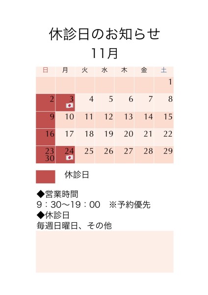 11月の休診日は毎週日曜日、3日(月・文化の日)、24日(月・振り替え休日)